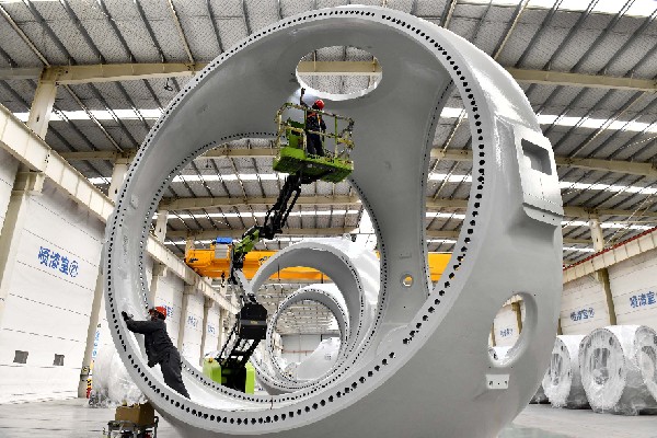 在山东省惠民县风电装备产业基地涂装车间,工作人员对风电轮毂进行涂装。