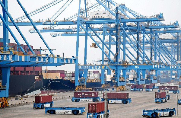 作业中的山东港口青岛港全自动化集装箱码头。