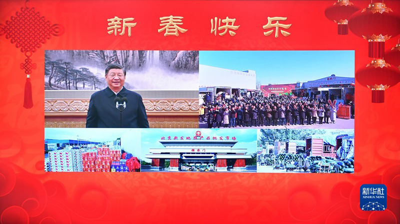1月18日,中共中央总书记、国家主席、中央军委主席习近平在北京通过视频连线看望慰问基层干部群众,向全国各族人民致以新春的美好祝福。这是习近平通过视频连线,同北京新发地农产品批发市场的商户和采购年货的群众亲切交流。(新华社记者 李涛/摄)